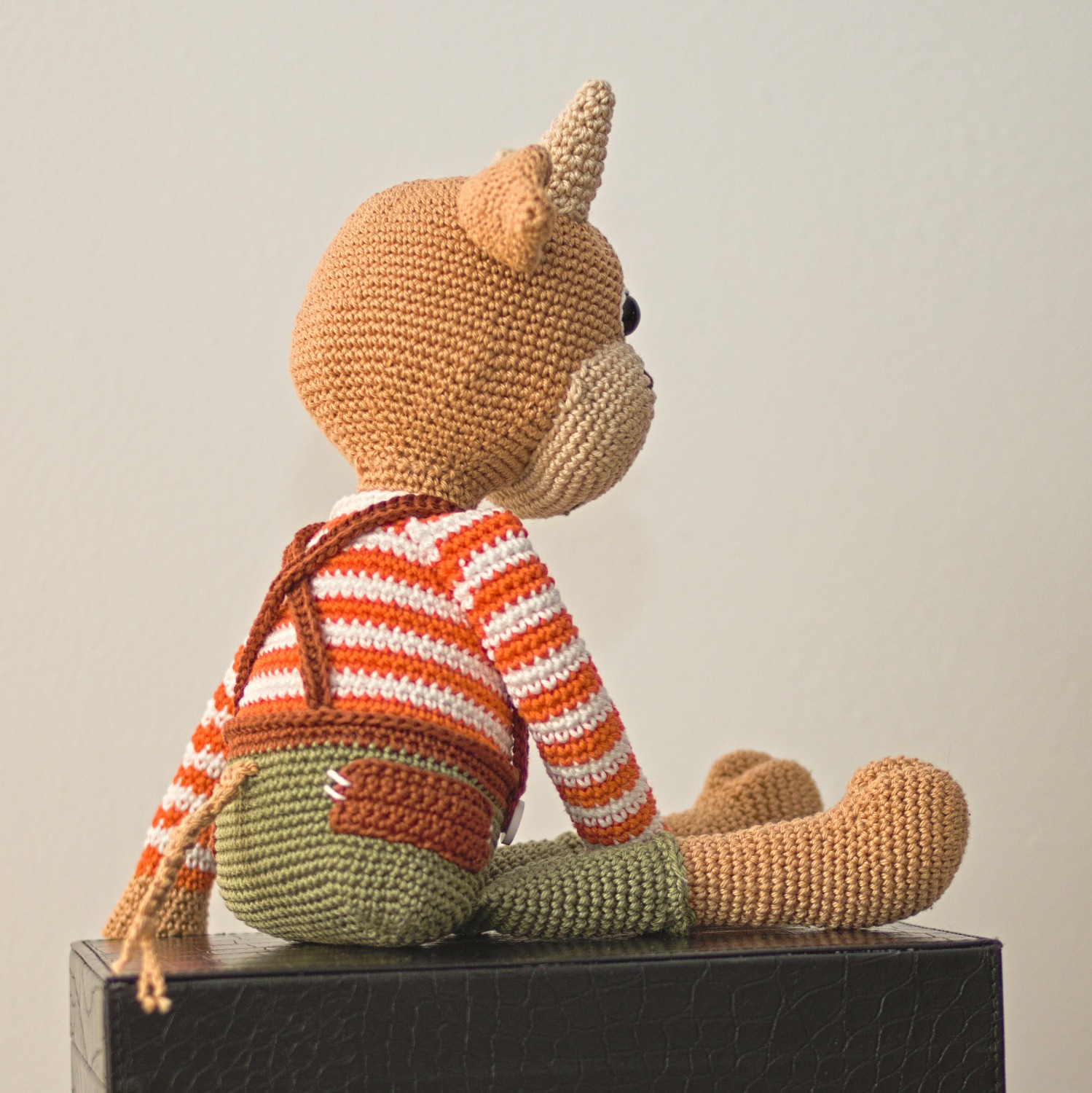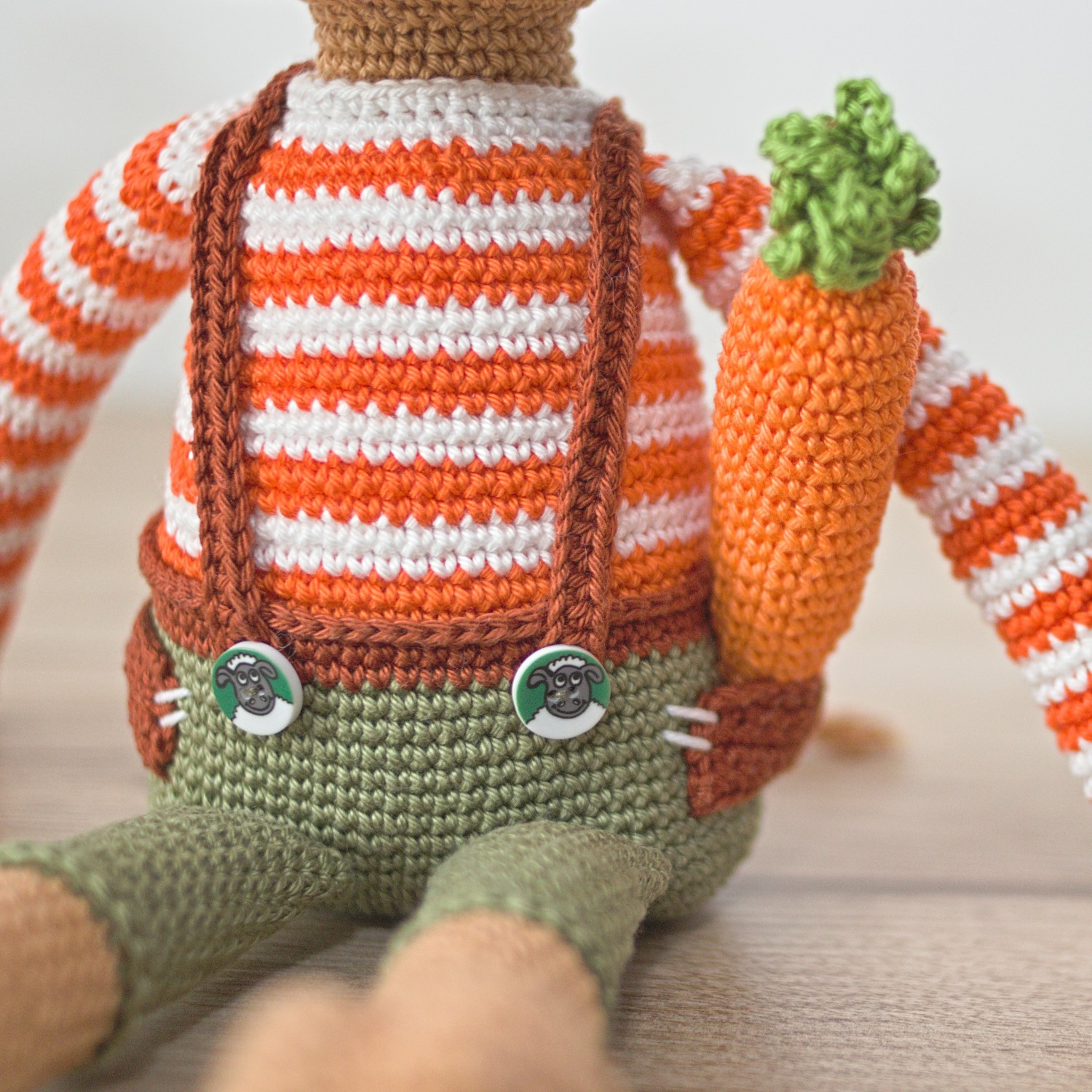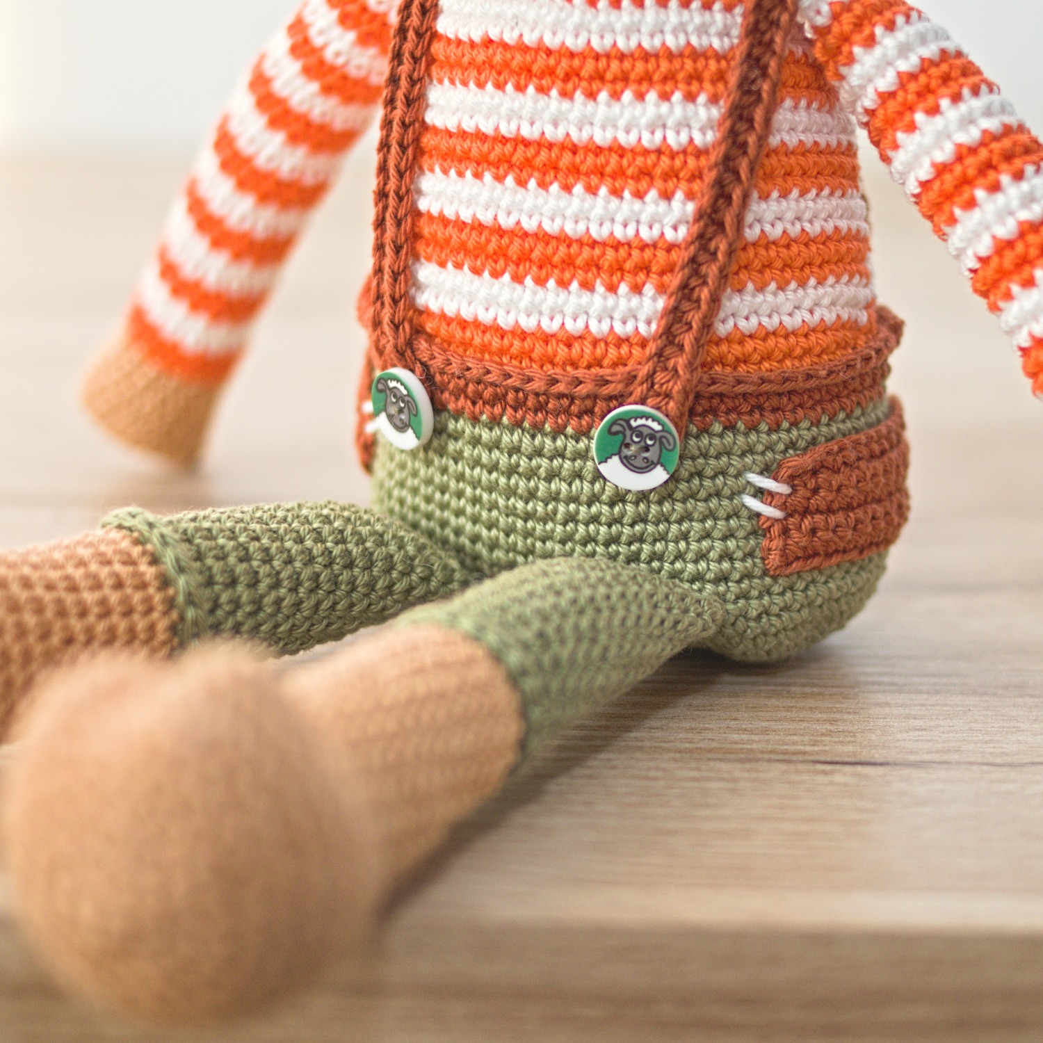 Das Kalb in seiner Hose ist eines der süßesten Tiere auf einem Häkelbauernhof. Der Junge dekoriert gerne, deshalb finden Sie viele Details darauf, wie Taschen, Knöpfe mit einem Schaf oder gekreuzte Hosenträger. Der Kalbsjunge kommt mit einer Karotte, damit er während der Fahrt keinen Hunger hat.